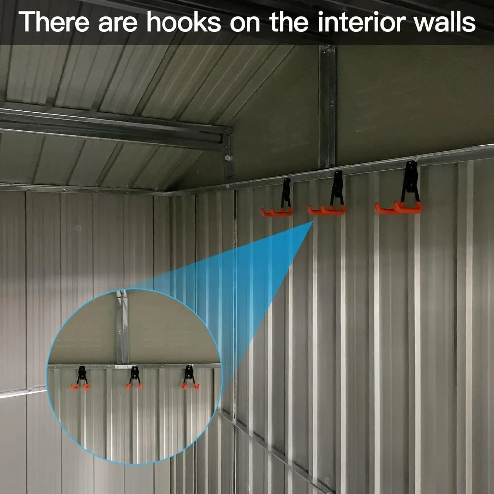 - ๐ก๐๐ง๐ข๐ช๐ฎ๐ ๐๐จ๐ซ๐๐ข๐ ๐๐๐ฌ๐ข๐ ๐ง: This 10x12 shed features a sloped gable roof that adds extra storage space, easily accommodating snow shovels, bicycles, a BBQ grill, trash bins, and gardening tools. The large metal storage building is equipped with a four-pane transparent window, not only providing a soft and comfortable light inside but also bringing a touch of fresh Nordic charm with its rustic, country-style design.